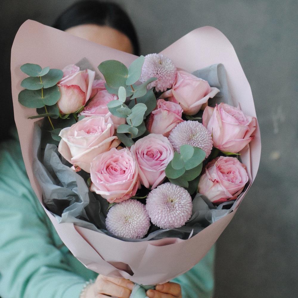 Роза пионовидная – 9 шт.момоко хризантема – 4 шт.Эвкалипт – 4 шт.
