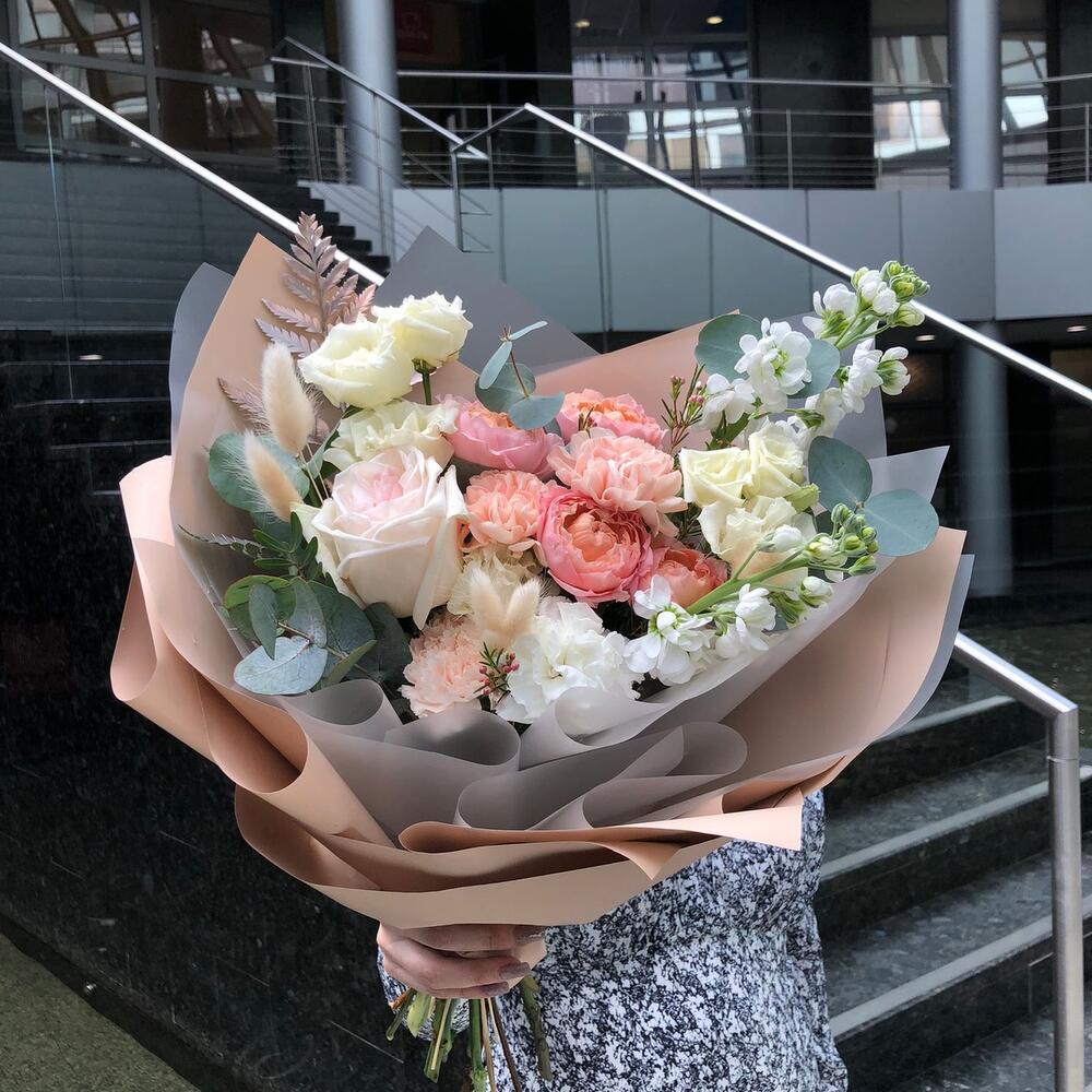 Роза кустовая джульетта – 1 шт.Маттиола белая – 2 шт.Лизиантус Алиса белый – 2 шт.Эвкалипт – 1 шт.Диантус – 3 шт.