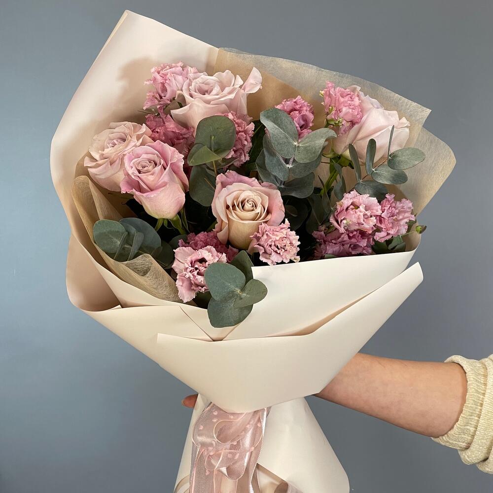 Лента – 2 шт.Лизиантус – 3 шт.Эвкалипт – 2 шт.Роза одноголовая – 5 шт.Упаковка дизайнерская – 2 шт.