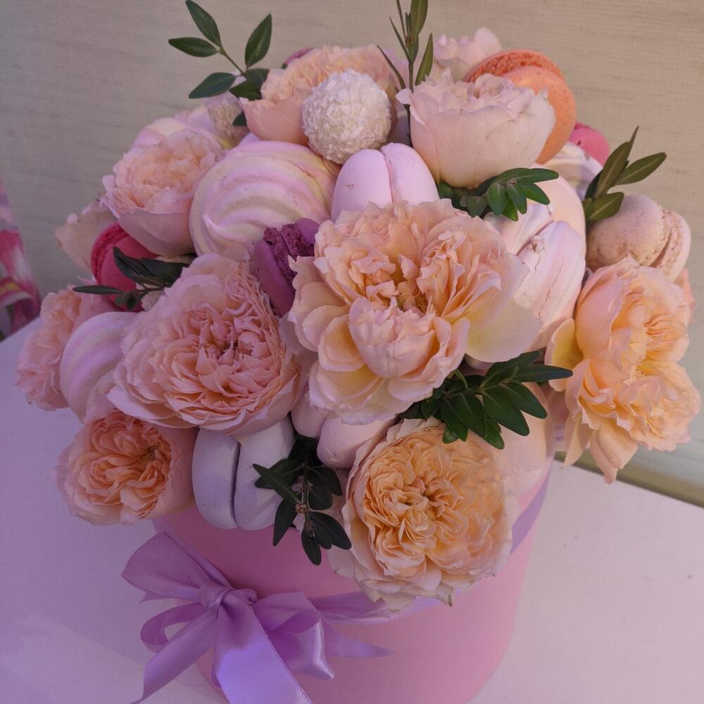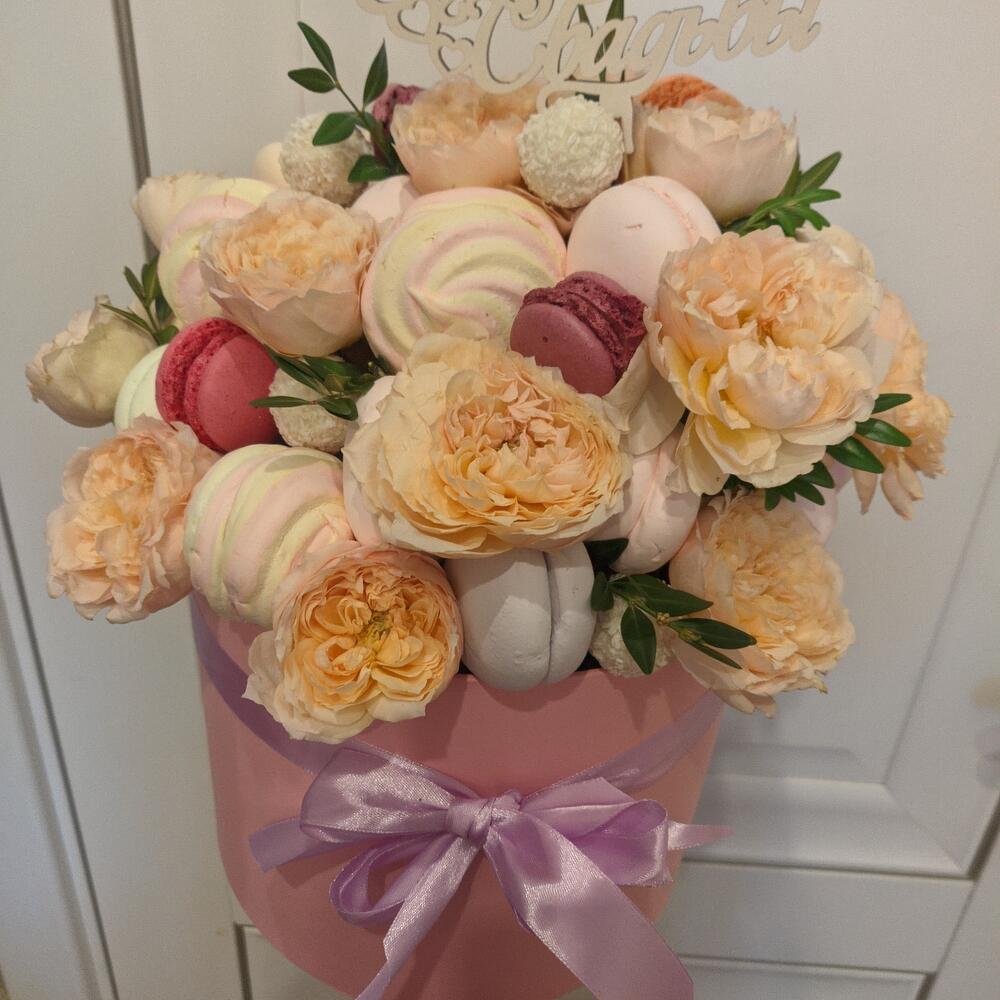Роза кустовая – 5 шт.Раффаэлло – 8 шт.Коробка шляпная – 1 шт.зелень декоративная – 1 шт.зефир цветной – 500 гр.маккаруны – 10 шт.зефир розово желтый – 300 гр.