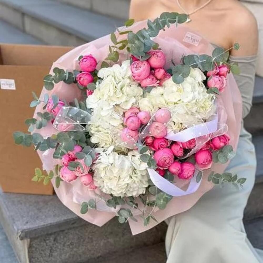 Букет "Sylvie" с гортензией, пионовидной розой и эвкалиптом. Заказав букет с доставкой от Da Vinci, Вы скрасите день обладательницы букета и подарите ей незабываемые эмоции.