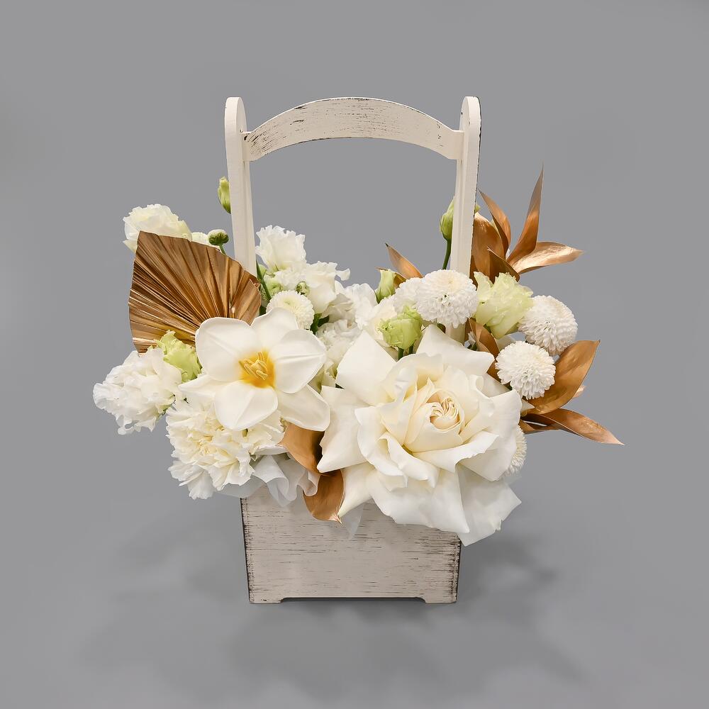 Французская роза – 1 шт.Тюльпан – 1 шт.Эустома – 2 шт.Гвоздика – 4 шт.Сантини – 2 шт.Рускус – 2 шт.Лист пальмы – 1 шт.Тишью – 1 шт.Ящик деревянный – 1 шт.