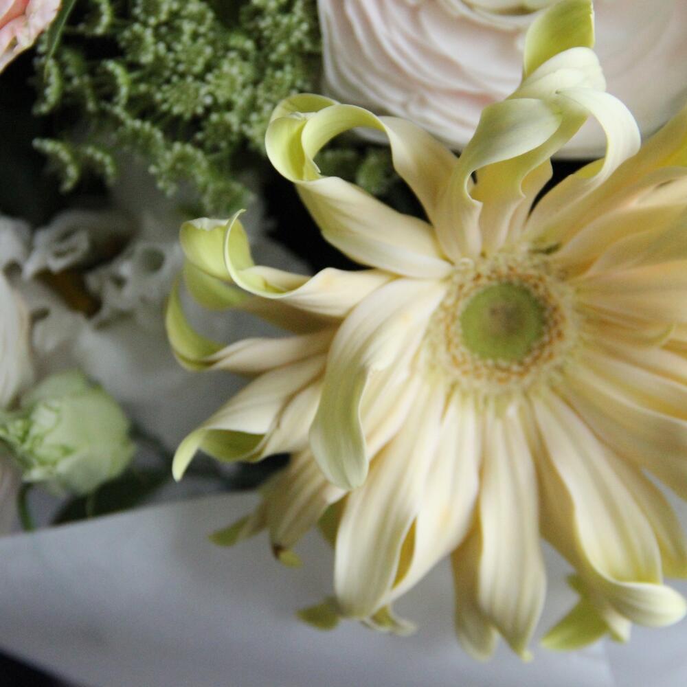 Ранункулюс – 3 шт.гербера кучерявая – 3 шт.Роза пионовидная – 3 шт.Роза кустовая пионовидная – 2 шт.Лизиантус – 3 шт.Амми – 4 шт.Упаковка – 1 шт.