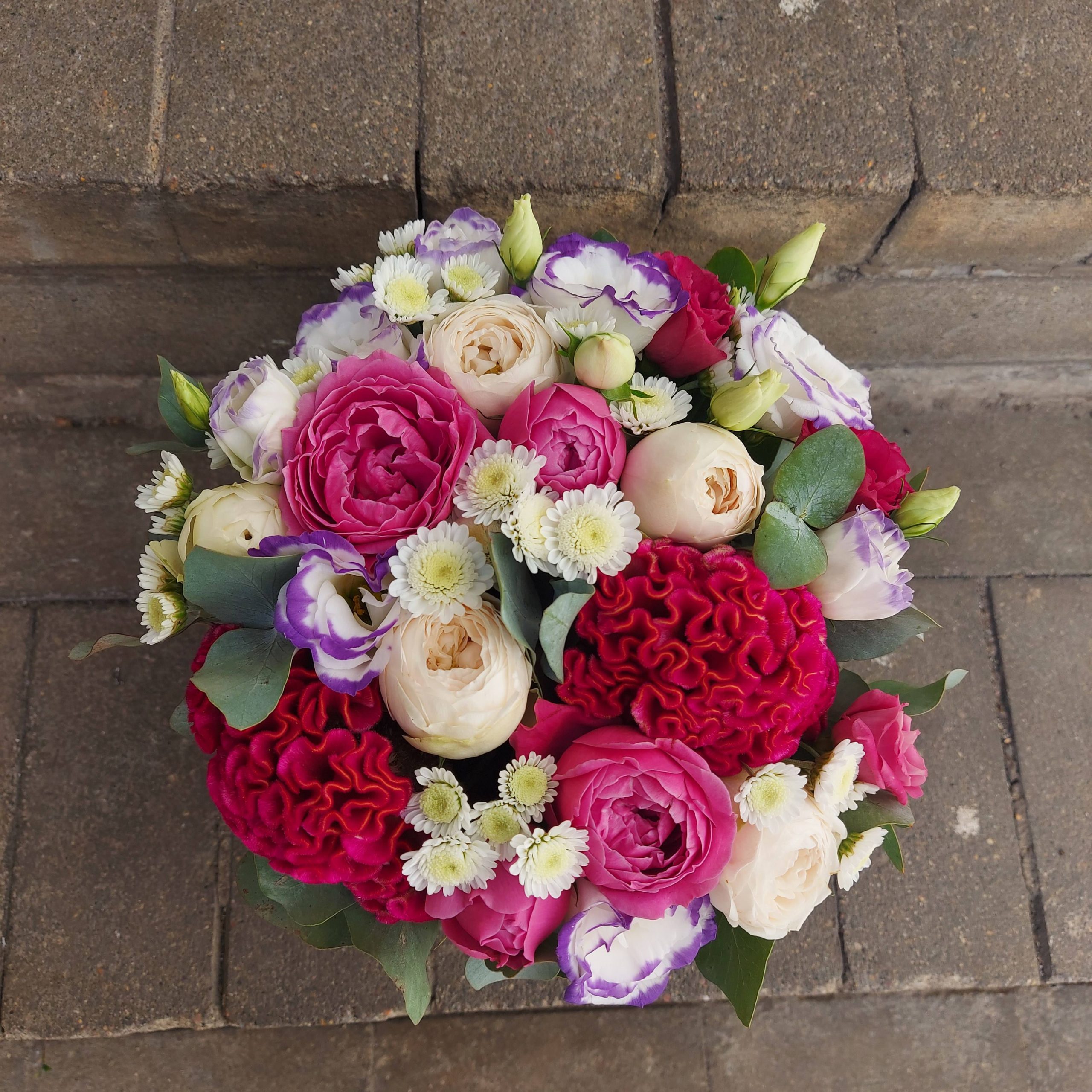 Букет из пионов, пионовидных и кустовых роз и эустом