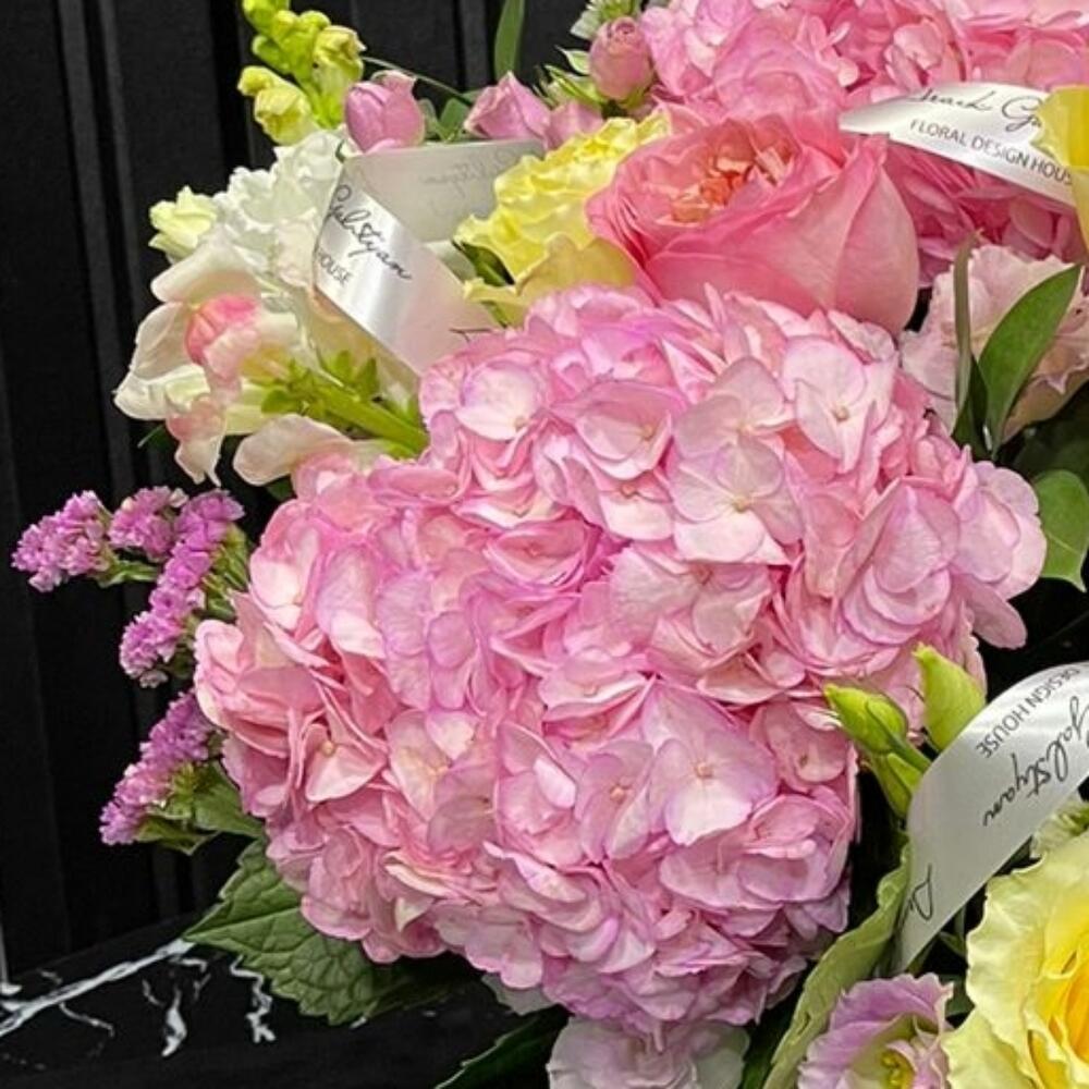 зелень альстромерия – 3 шт. Роза – 8 шт. Гортензия розовая – 3 шт. Лизиантус – 4 шт. Львиный зев – 5 шт. Статица – 3 шт. Роза кустовая – 2 шт. Рускус – 7 шт.