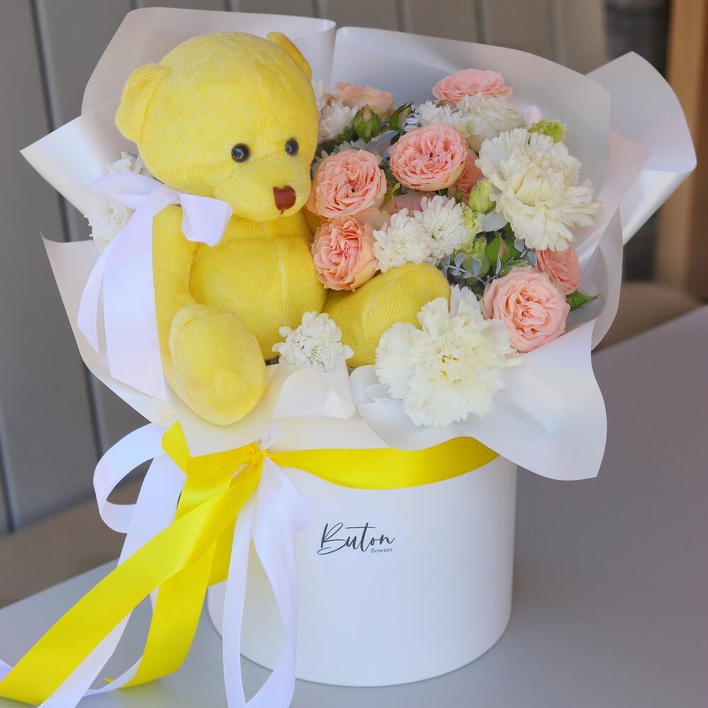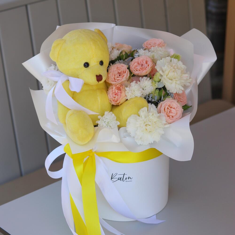 Роза кустовая – 1 шт.Гвоздика – 3 шт.Лента атласная – 1 шт.Сантини – 1 шт.Фисташка – 1 шт.Шляпная коробка – 1 шт.Мишка плюшевый – 1 шт.Открыточка с вашими пожеланиями – 1 шт.Шоколадка – 1 шт.