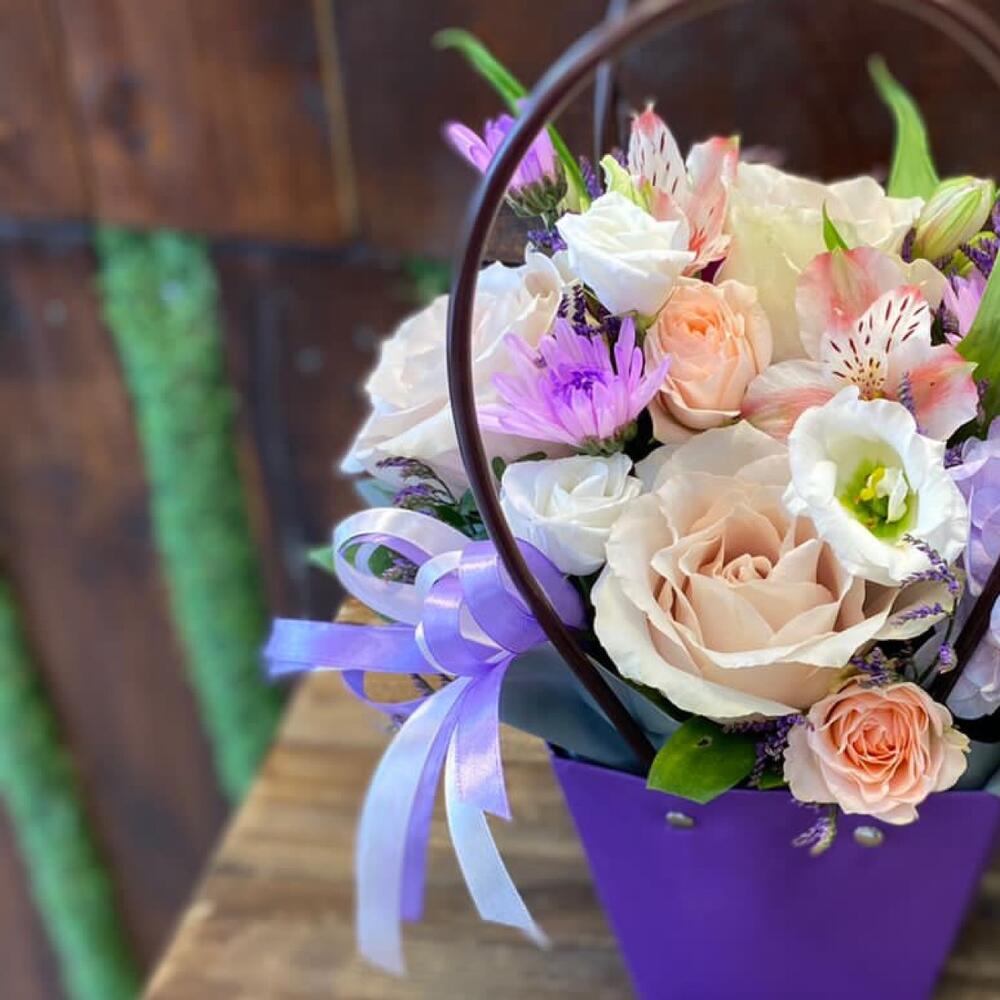 Роза Эквадор – 3 шт.Роза кустовая – 1 шт.Гортензия – 1 шт.Эустома – 1 шт.Альстромерия – 1 шт.Сумочка – 1 шт.Оазис флористический – 1 шт.Лимониум – 1 шт.