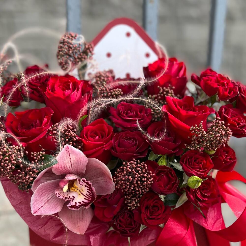 конверт картонный – 1 шт.Оазис флористический – 1 шт.Тишью – 1 шт.Лента атласная – 2 шт.Скиммия – 2 шт.Роза одноголовая – 5 шт.ЦИМБИДИУМ – 1 шт.Стифа – 2 шт.Роза кустовая – 5 шт.