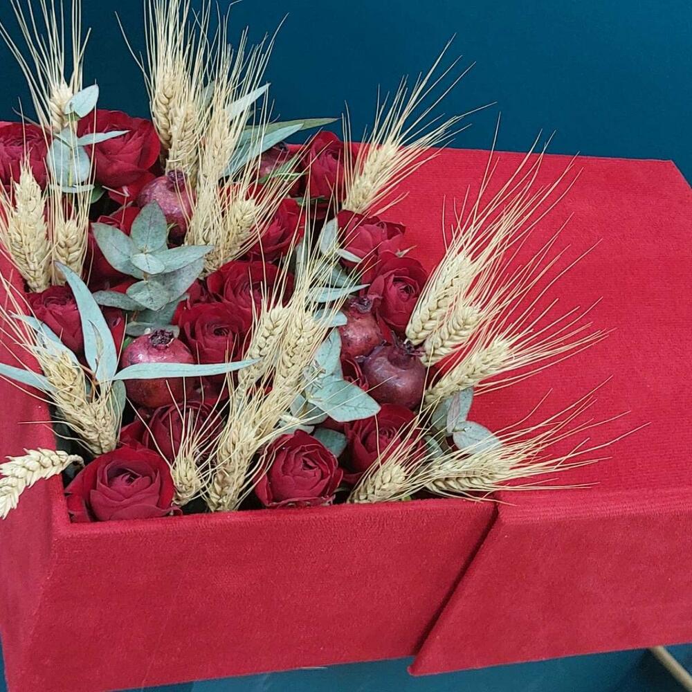 Роза кустовая пионовидная – 4 шт. Эвкалипт – 4 шт. пшиница – 10 шт. гранат мини – 7 шт. торт прага – 1 шт.