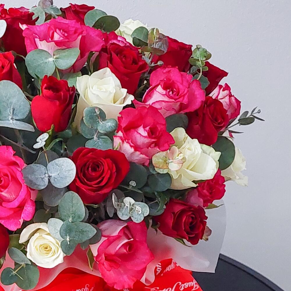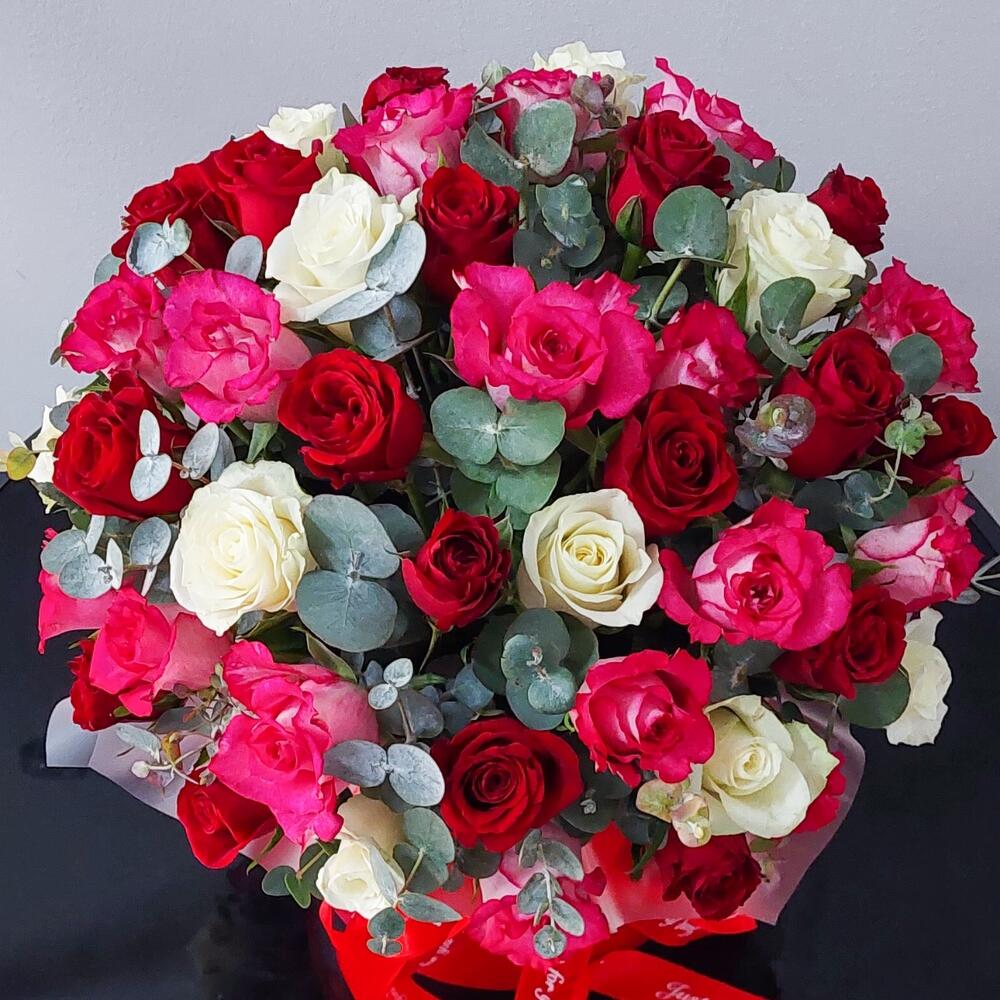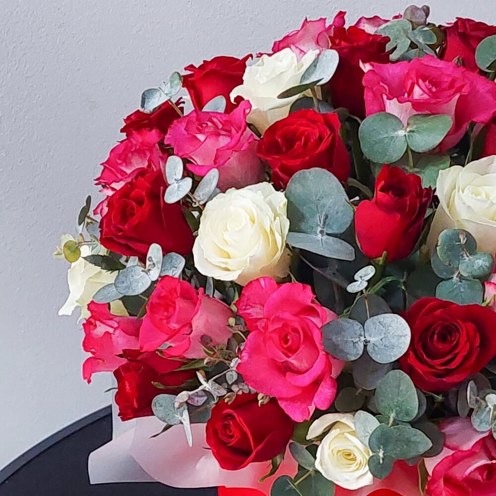 51 роза микс и эвкалипт в шляпной коробке.