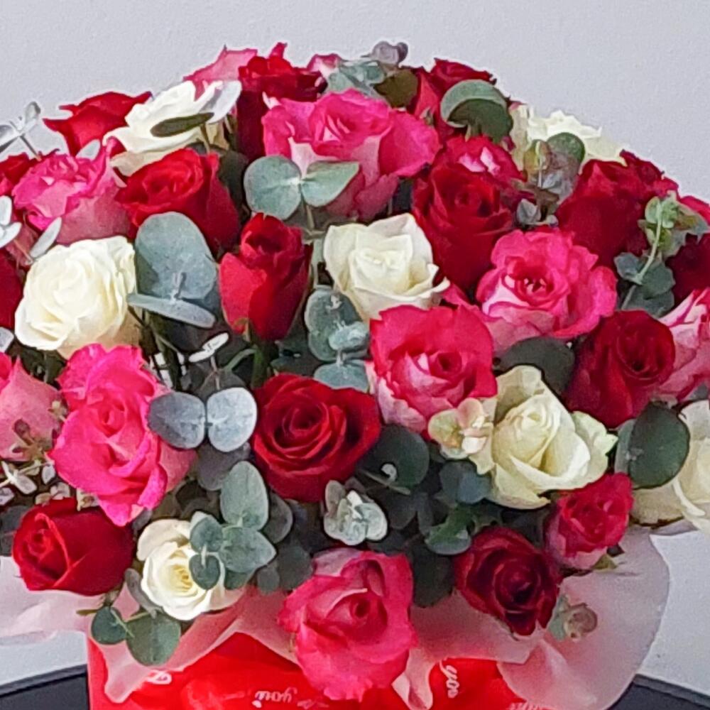 Лента атласная – 3 шт.Пленка матовая – 1 шт.Открыточка с вашими пожеланиями – 1 шт.Шляпная коробка большая – 1 шт.Оазис флористический – 2 шт.Эвкалипт Baby Blue – 9 шт.роза микс – 51 шт.транспортировочная упаковка – 1 шт.