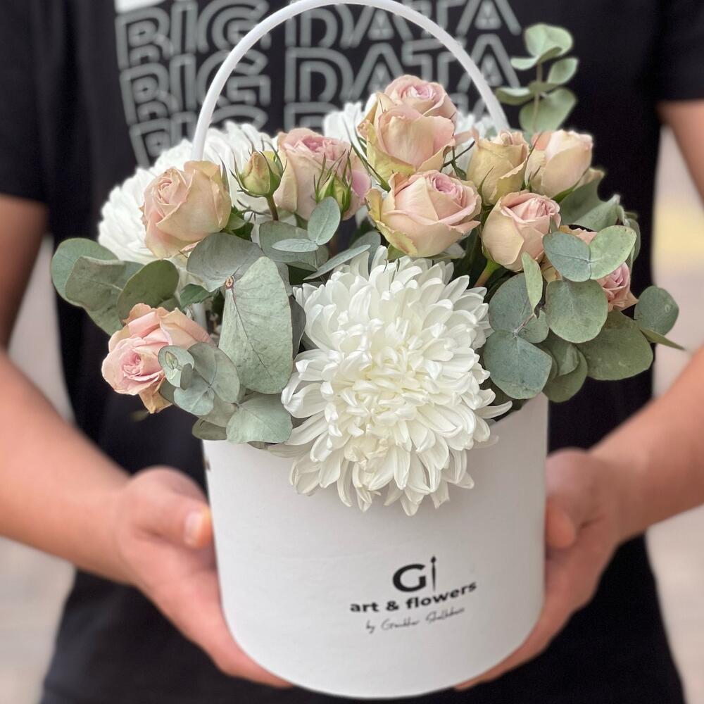 Цветы в коробке из Гортензии ,Кустовых Роз и Эвкалипта + открытка ручной работы в подарок