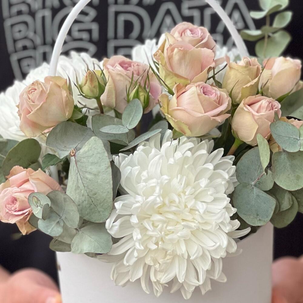 Хризантема – 3 шт. Кустовая роза – 2 шт. Эвкалипт – 2 шт.