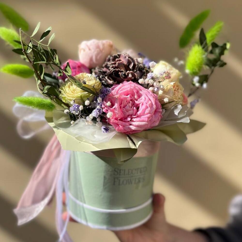 Гортензия и пионовидные розы Охара в большой коробке "Белоснежка"