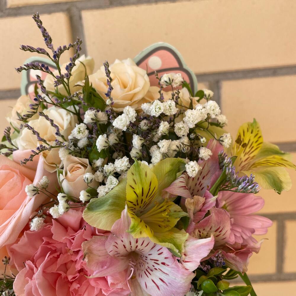 Альстромерия – 2 шт.Роза – 2 шт.Роза кустовая – 1 шт.Гипсофила – 3 шт.Лимониум – 1 шт.Губка флористическая – 1 шт.коробка для цветов – 1 шт.