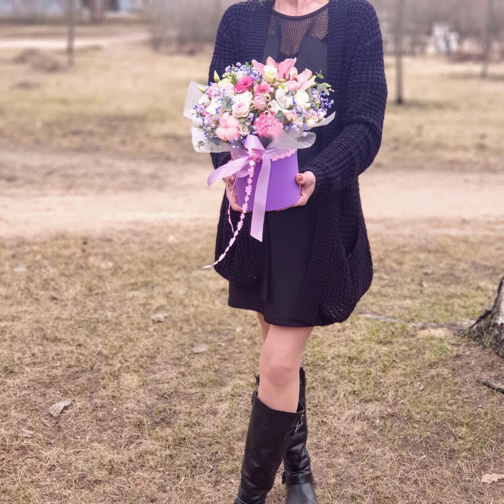 Альстромерия – 1 шт.Лизиантус – 2 шт.Эвкалипт – 1 шт.Лента атласная – 1 шт.Коробка шляпная – 1 шт.Роза белая – 3 шт.Роза кустовая пионовидная – 2 шт.Лилия Азиатская розовая – 1 шт.Оазис флористический – 1 шт.Хамелациум белый – 1 шт.гипсофила сиреневая – 1 шт.хлопок розовый – 1 шт.тесьма кружево – 1 шт.любовь флориста (бесплатно) – 1 шт.диантус розовый (гвоздика ) – 1 шт.