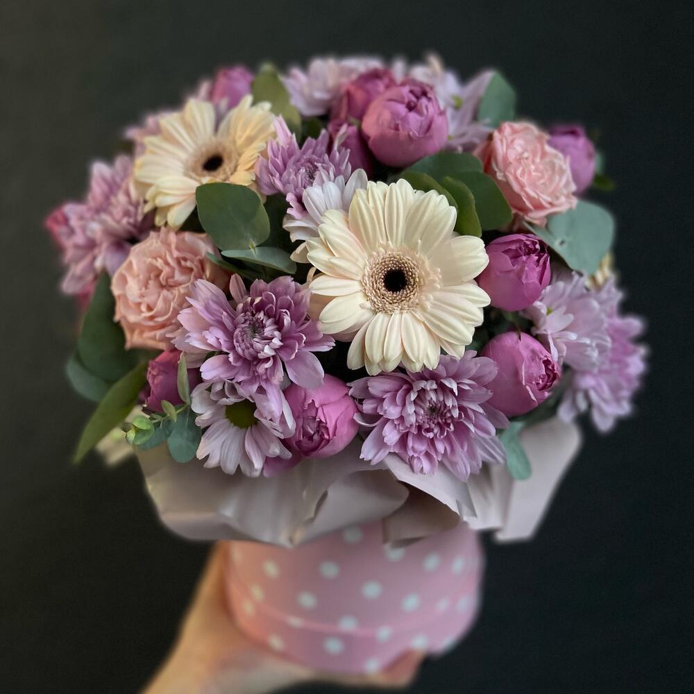 Кустовая роза – 5 шт.Гербера – 5 шт.Кустовая хризантема – 4 шт.Эвкалипт – 2 шт.Коробка шляпная – 1 шт.Флористическая губка – 1 шт.
