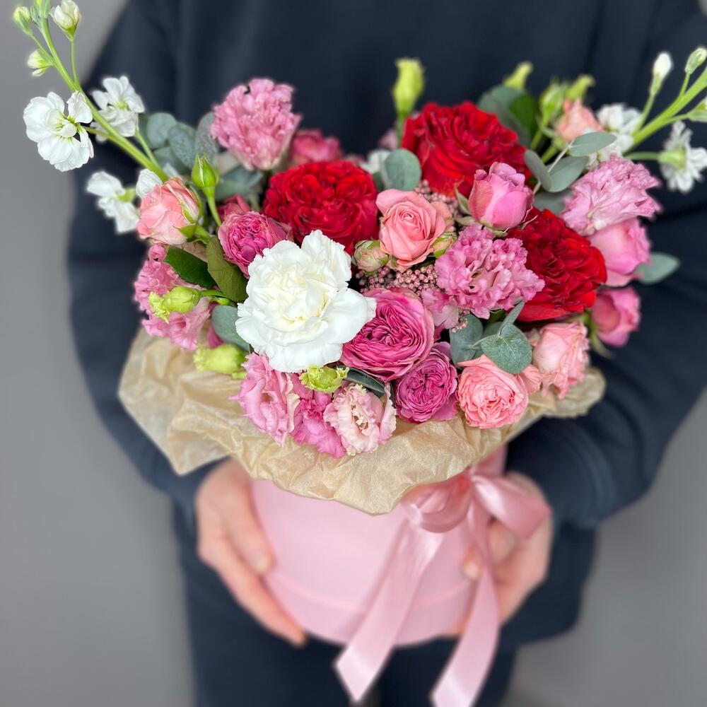Лизиантус – 3 шт.Маттиола – 3 шт.Озотамнус – 3 шт.Роза кустовая – 3 шт.Роза одноголовая – 3 шт.Гвоздика – 3 шт.Коробка шляпная – 1 шт.комплимент от polyanka – 1 шт.