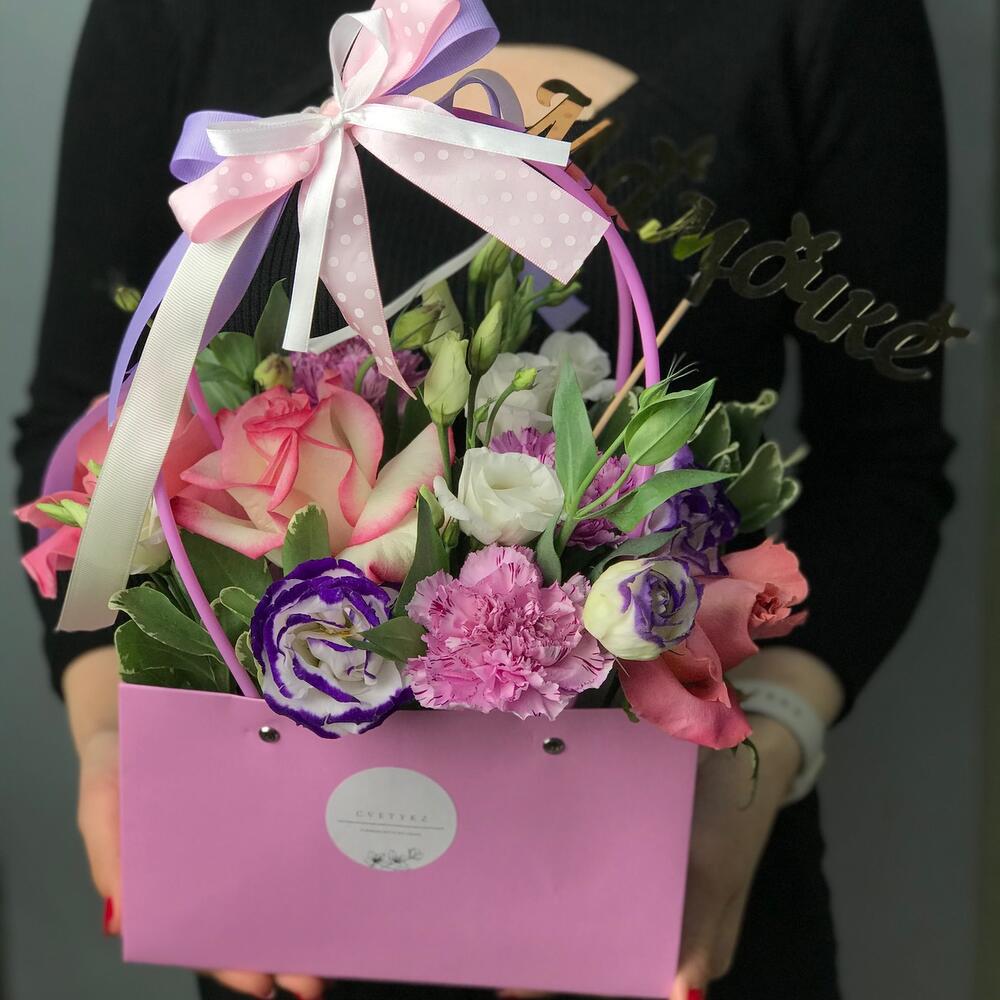 Гвоздики, Лизиантусы, Розы, Тюльпаны