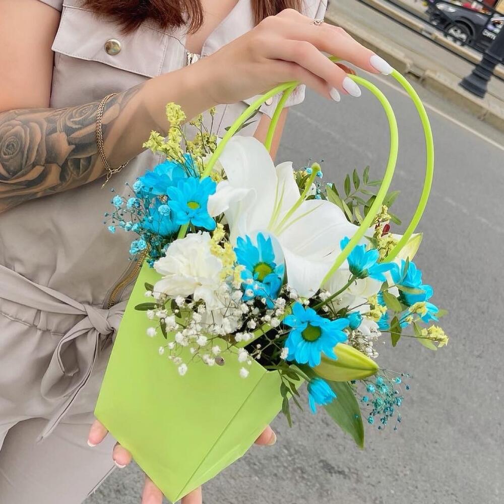 Лилия – 1 шт.Хризантема кустовая – 1 шт.Лимониум – 1 шт.Роза – 1 шт.Гипсофила – 1 шт.Гвоздика – 1 шт.Оазис флористический – 1 шт.Сумочка картонная – 1 шт.