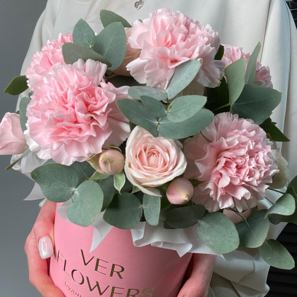 Диантусы с кустовыми розами в коробке