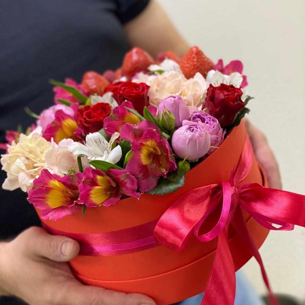 Альстромерия – 3 шт.Гортензия – 2 шт.Клубника – 9 шт.Роза красная – 5 шт.Оазис – 1 шт.Коробка – 1 шт.Пирожные макарон – 3 шт.роза мисти бабл – 2 шт.