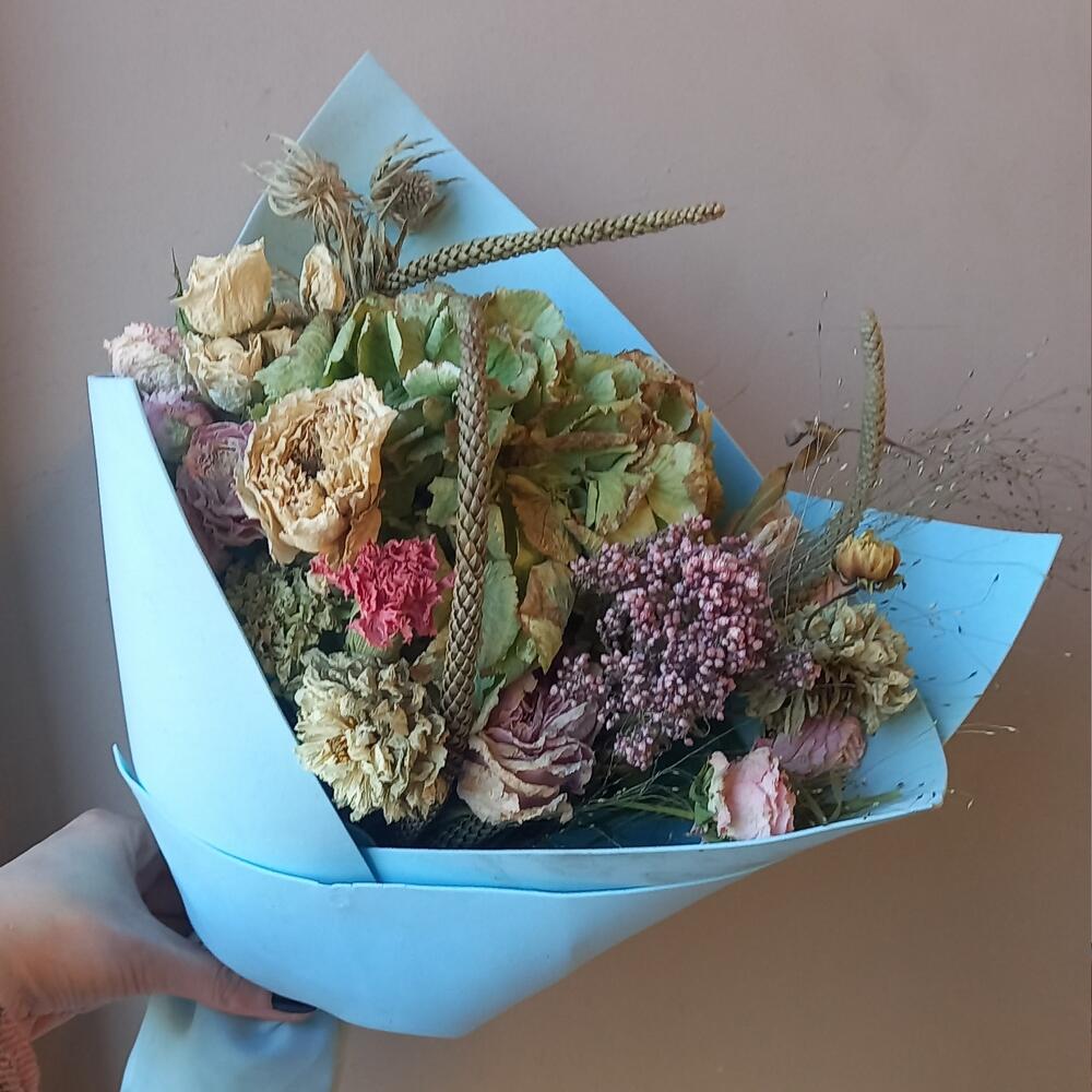 Гортензия – 1 шт.Эрингиум зеленый – 1 шт.Роза кустовая – 2 шт.Роза – 3 шт.Оксипеталум – 1 шт.Гвоздика – 3 шт.