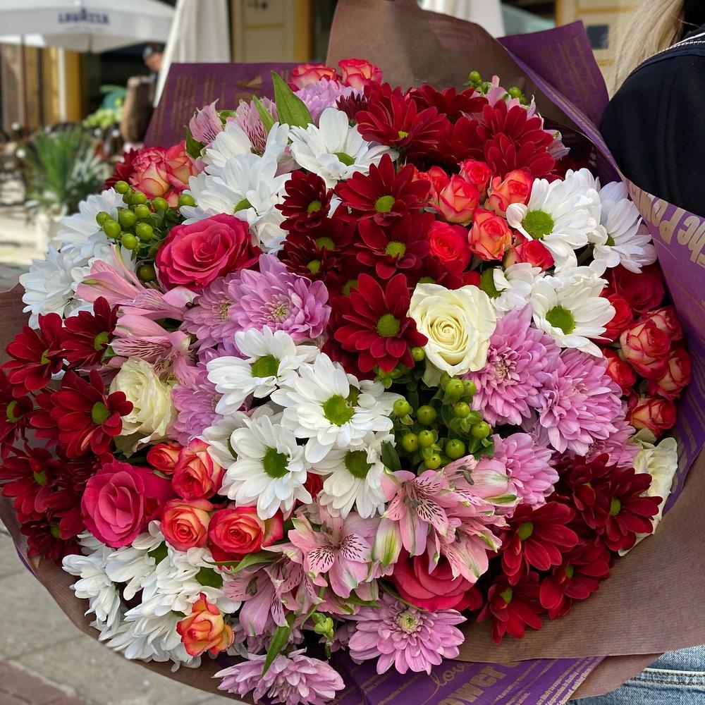 Гиперикум – 3 шт. Роза розовая – 5 шт. Роза белая – 5 шт. Роза кустовая розовая – 5 шт. Альстромерия розовая – 5 шт. Хризантема красная – 5 шт. Хризантема розовая – 5 шт. Упаковка дизайнерская – 1 шт. Хризантема белая – 5 шт.