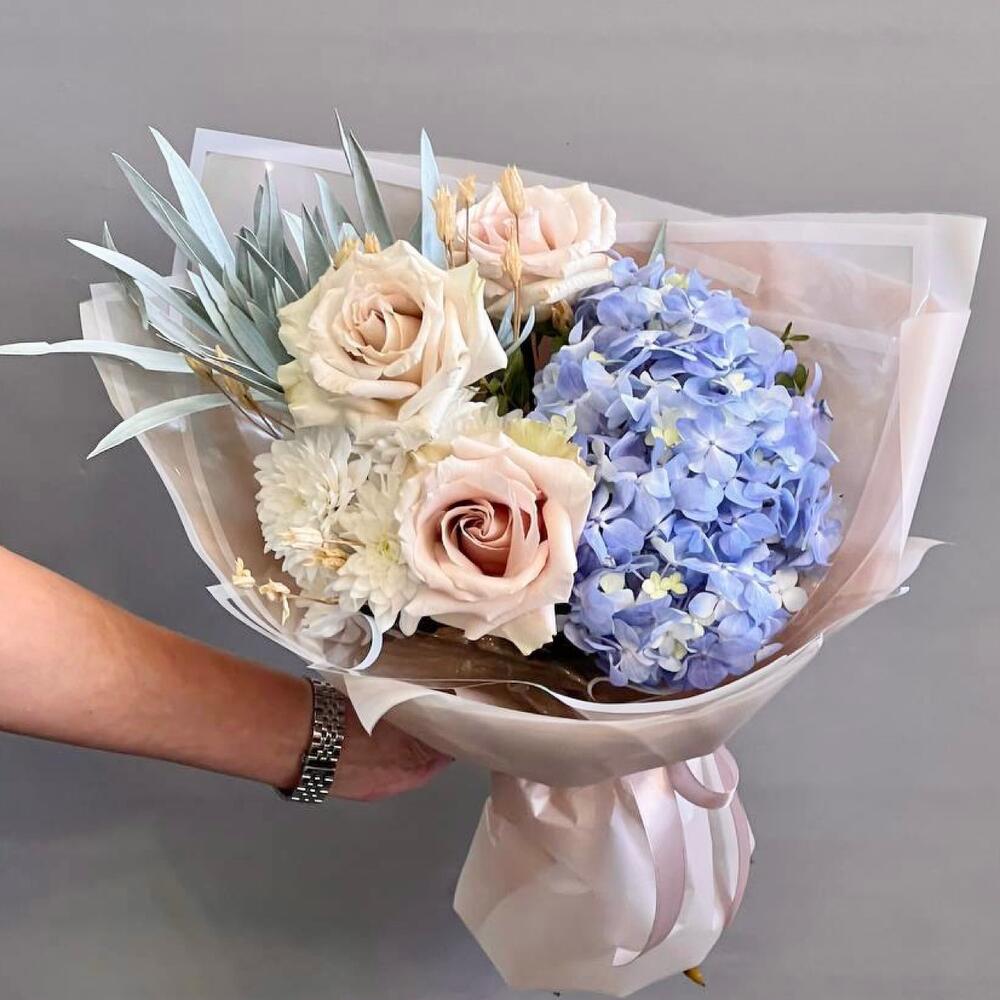 Гортензия – 1 шт.Хризантема кустовая – 1 шт.Роза Эквадор – 3 шт.Фисташка – 1 шт.Упаковка дизайнерская – 1 шт.олеандр – 1 шт.овес пучок – 1 шт.