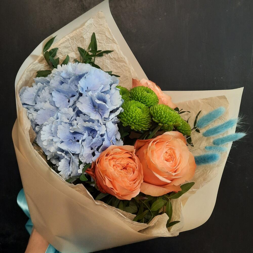 Гортензия – 1 шт.Кустовая хризантема – 1 шт.Роза пионовидная – 3 шт.Фисташка – 1 шт.Лагурус – 5 шт.Упаковка дизайнерская – 1 шт.