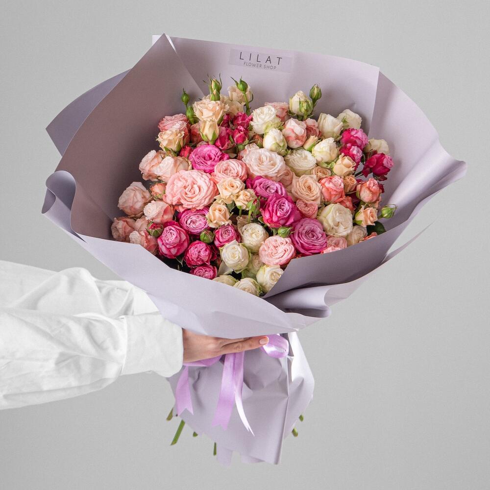 Упаковка дизайнерская – 3 шт. Открыточка с вашими пожеланиями – 1 шт. кустовые пионовидные розы – 51 шт.