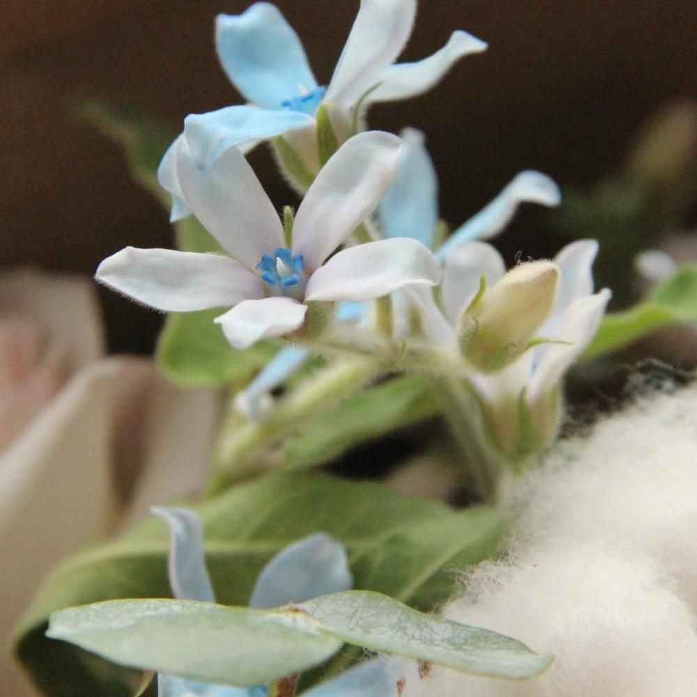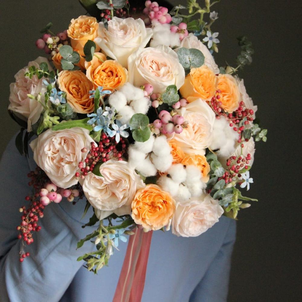 Букет с хлопком, пионовидными розами, твидией, снежноягодником и эвкалиптом.Стильное цветочное решение длялюбого случая.Ширина букета около 50 сантиметров, высота букета около 50 сантиметров.