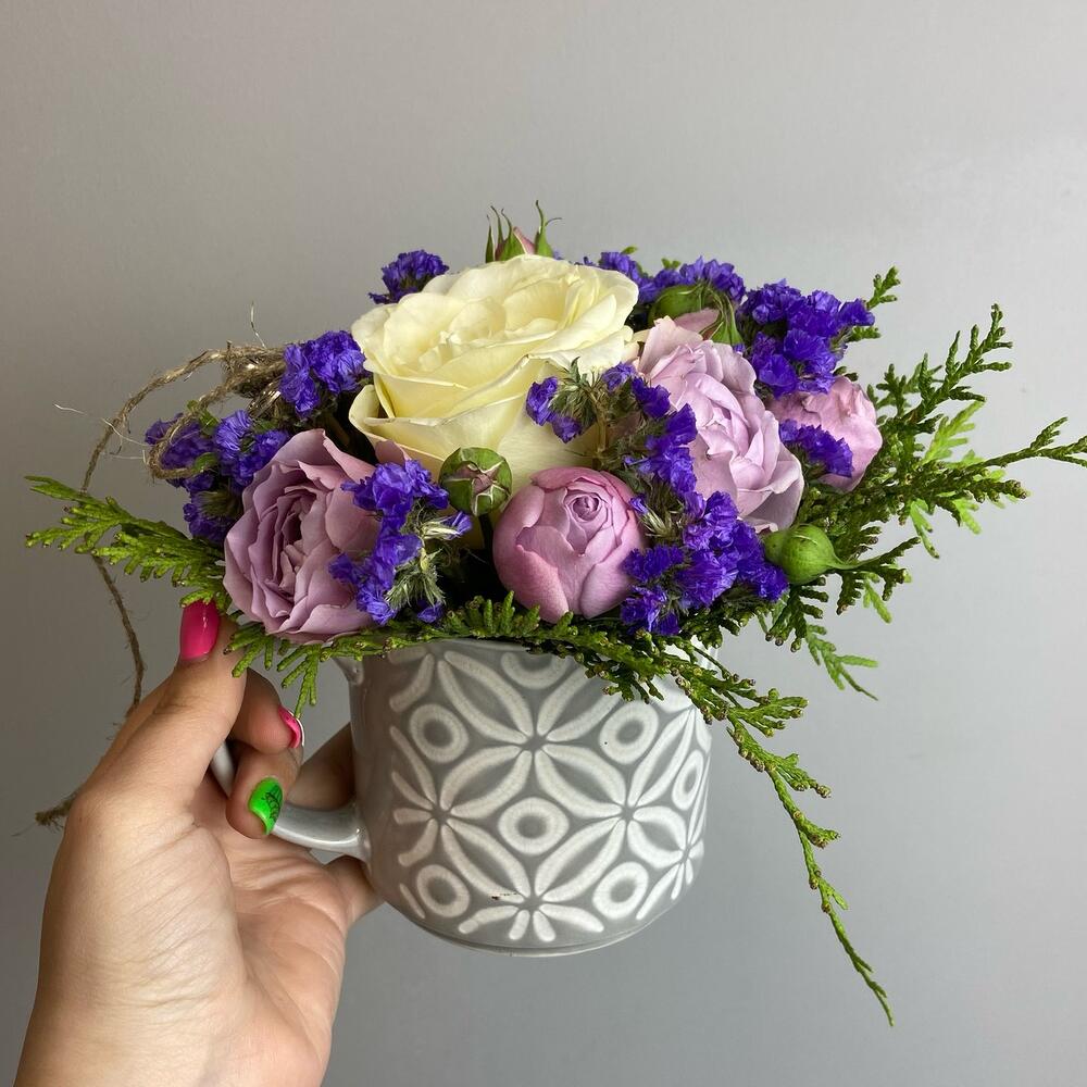 Роза одноголовая – 1 шт.Роза кустовая – 3 шт.Статица – 1 шт.туя ветка – 1 шт.Декор – 1 шт.Оазис флористический – 1 шт.кружка керамическая – 1 шт.