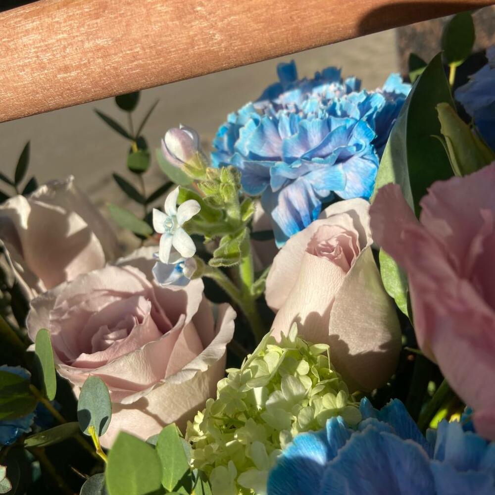 Дельфиниум – 1 шт.Лизиантус – 2 шт.Эвкалипт – 1 шт.Роза Эквадор – 6 шт.Оксипеталум – 2 шт.Ящик деревянный – 1 шт.Оазис флористический – 1 шт.Хавортия – 1 шт.Диантус сортовой – 6 шт.