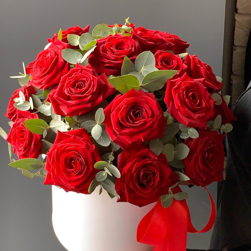 Эвкалипт – 4 шт.Лента атласная – 2 шт.Коробка шляпная – 1 шт.Оазис флористический – 1 шт.роза ред наоми. – 21 шт.