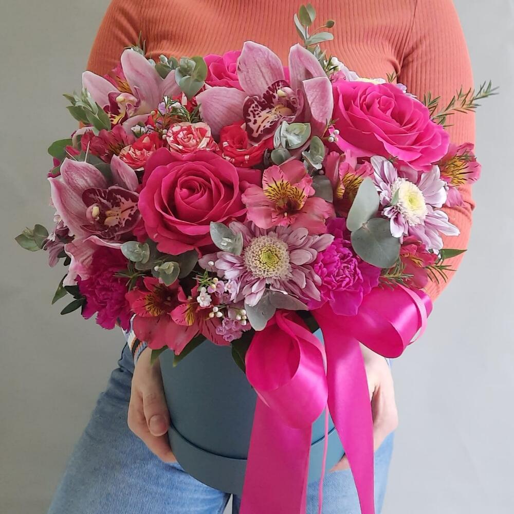 Роза – 3 шт.Орхидея Цимбидиум – 3 шт.Диантус – 5 шт.Роза кустовая – 1 шт.Хризантема кустовая – 1 шт.Альстромерия – 3 шт.Эвкалипт – 2 шт.Рускус – 7 шт.Самшит – 2 шт.Ваксфлауэр – 1 шт.Оазис флористический – 1 шт.Коробка шляпная – 1 шт.Лента атласная – 2 шт.