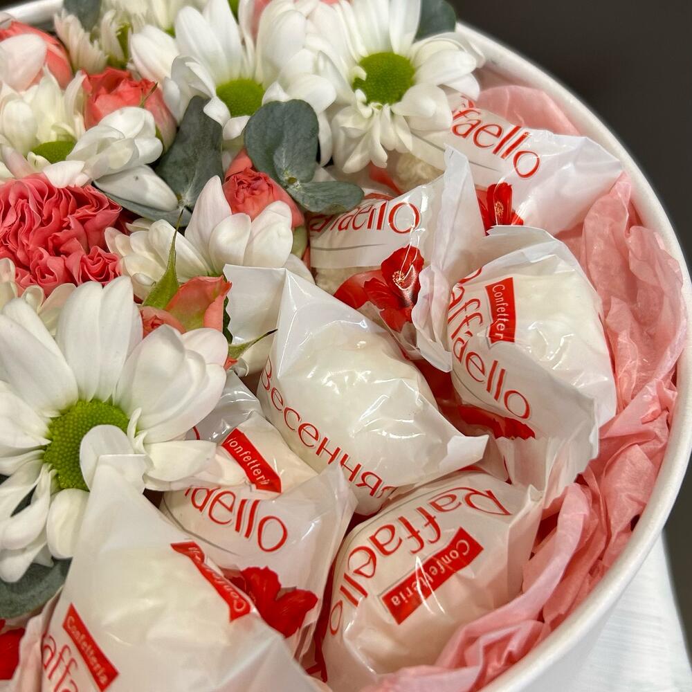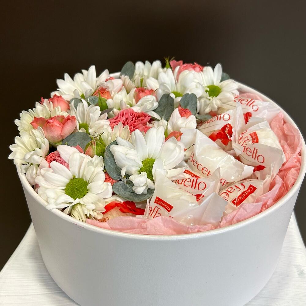 Композиция в коробке из белой кустовой хризантемы, кустовой розы и рафаэлло