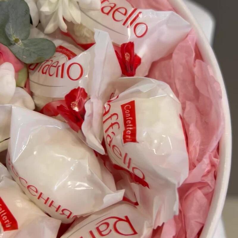 Пиафлор (оазис) – 1 шт.Роза кустовая – 2 шт.Хризантема кустовая – 1 шт.Раффаэлло – 8 шт.Коробка – 1 шт.Упаковка дизайнерская – 2 шт.зелень декоративная – 1 шт.