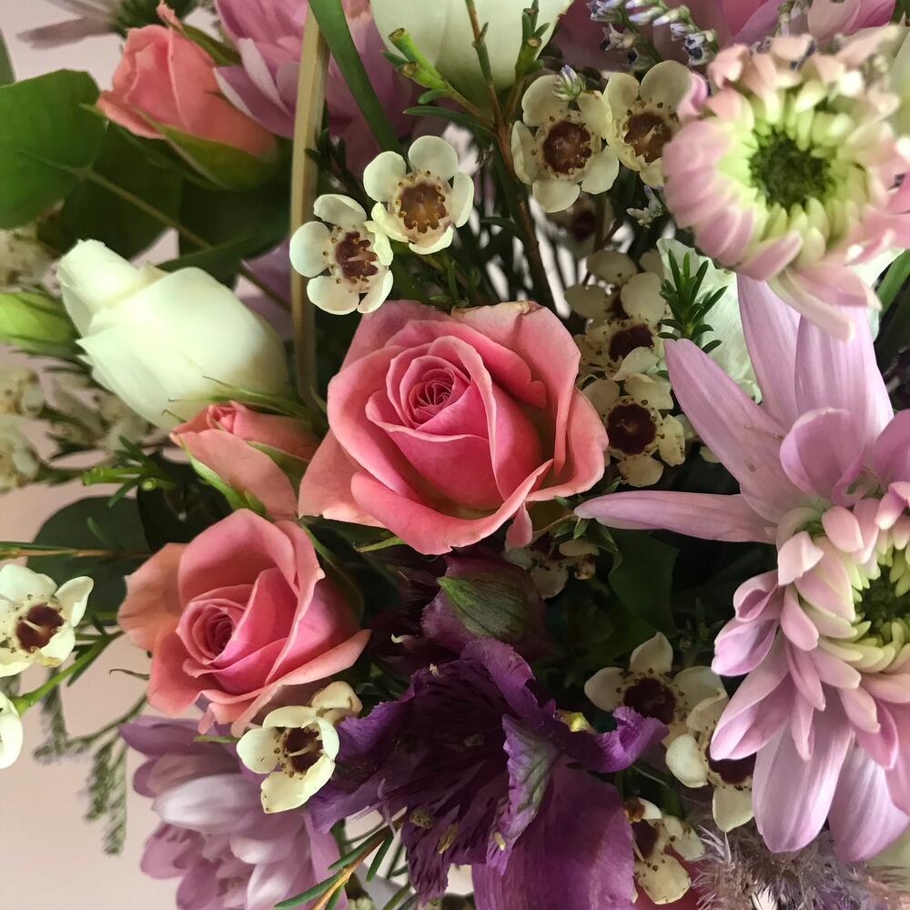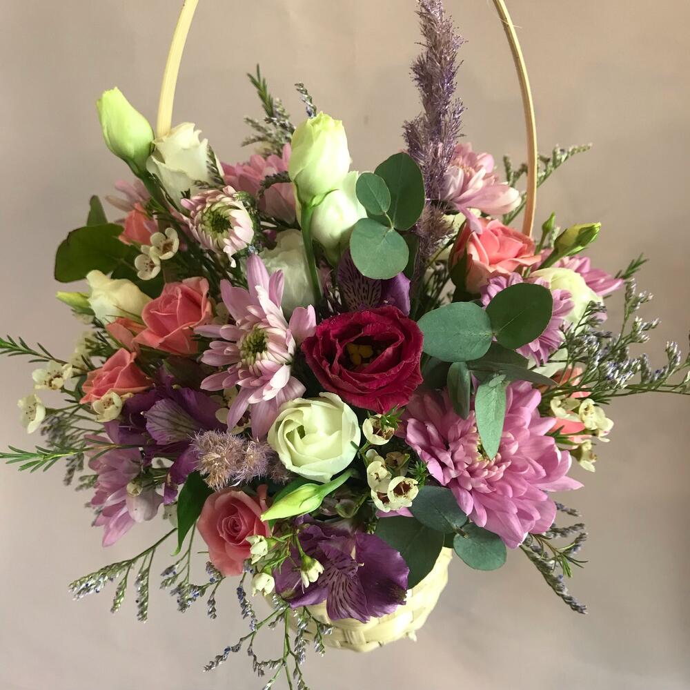 Альстромерия – 1 шт.Ваксфлауэр – 3 шт.Лизиантус – 3 шт.Лимониум – 3 шт.Роза кустовая – 1 шт.Хризантема кустовая – 2 шт.Эвкалипт – 2 шт.Корзина плетеная – 1 шт.декор трава – 2 шт.