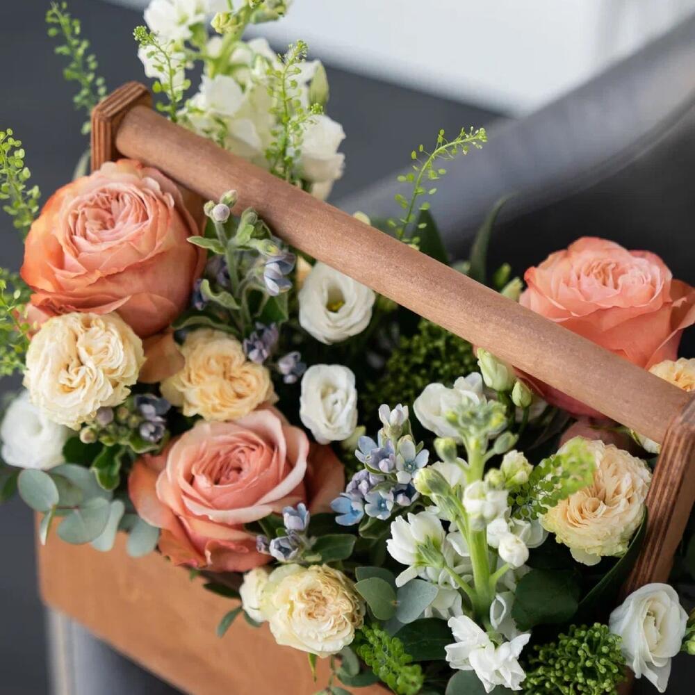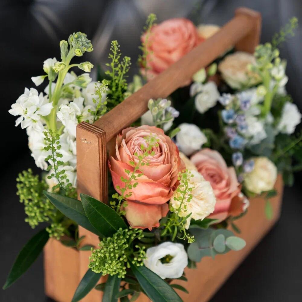 Лизиантус – 4 шт.Маттиола – 2 шт.Эвкалипт – 2 шт.Роза кустовая пионовидная – 3 шт.Скиммия – 3 шт.Гринбелл – 2 шт.Роза садовая – 3 шт.Оксипеталум – 4 шт.Ящик деревянный – 1 шт.Оазис флористический – 1 шт.