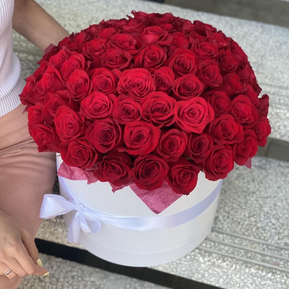 роза красная фридом – 75 шт. Коробка – 1 шт. Оазис – 4 шт. Оформление – 1 шт.