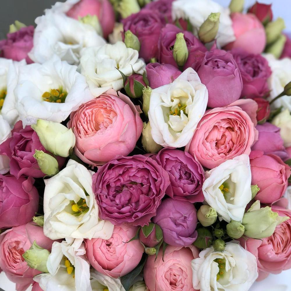Эустома – 5 шт. Кустовая пионовидная роза – 15 шт. Писташ – 2 шт. Коробка – 1 шт. Оазис – 4 шт.