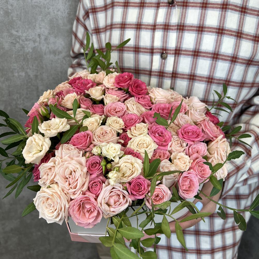 Большая коробка с нежными цветами: розами, лизиантусом и эвкалиптом