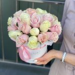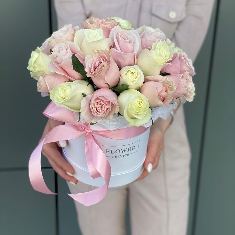 Роза розовая – 15 шт. Роза белая – 10 шт. Коробка – 1 шт. Оазис – 1 шт.