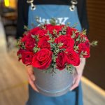Роза Эквадор Красная – 25 шт.зелень эвкалипта – 2 шт.Коробка шляпная – 1 шт.Оазис флористический – 1 шт.