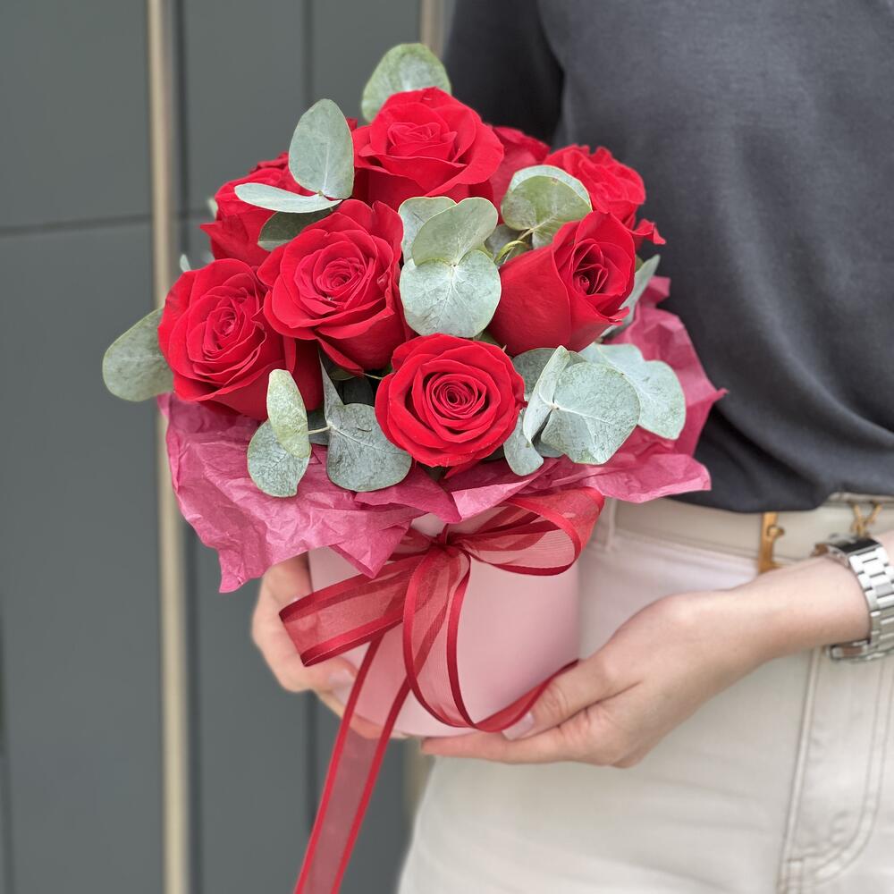 Роза красная – 9 шт. Эвкалипт – 1 шт. Оазис – 1 шт. Коробка – 1 шт. Оформление – 1 шт.