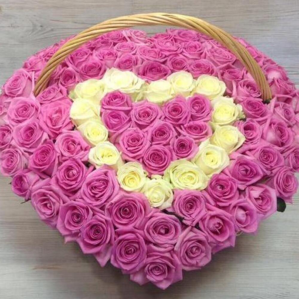 Розовая роза – 79 шт.белая роза – 14 шт.Корзина плетеная – 1 шт.Оазис флористический – 3 шт.