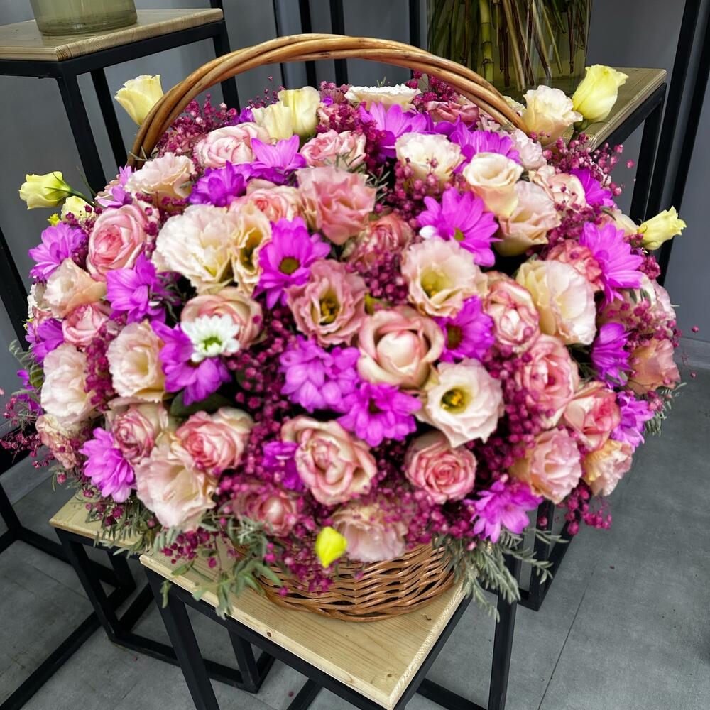 Роза – 29 шт. Хризантема – 33 шт. Эустома – 11 шт. зелень декоративная – 5 шт. Корзина плетеная – 1 шт.