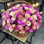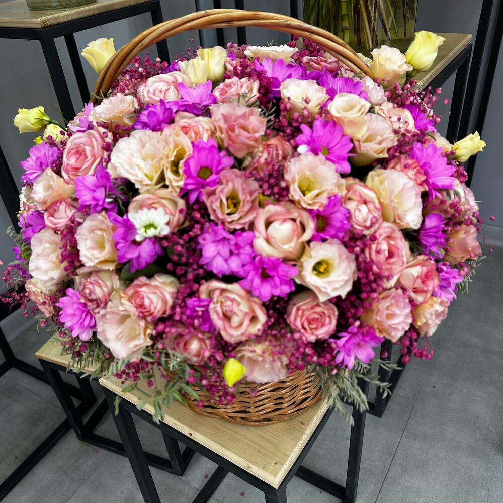 Роза – 29 шт. Хризантема – 33 шт. эустомы микс – 11 шт. Корзина плетеная – 1 шт. зелень декоративная – 5 шт.