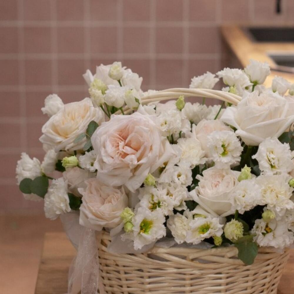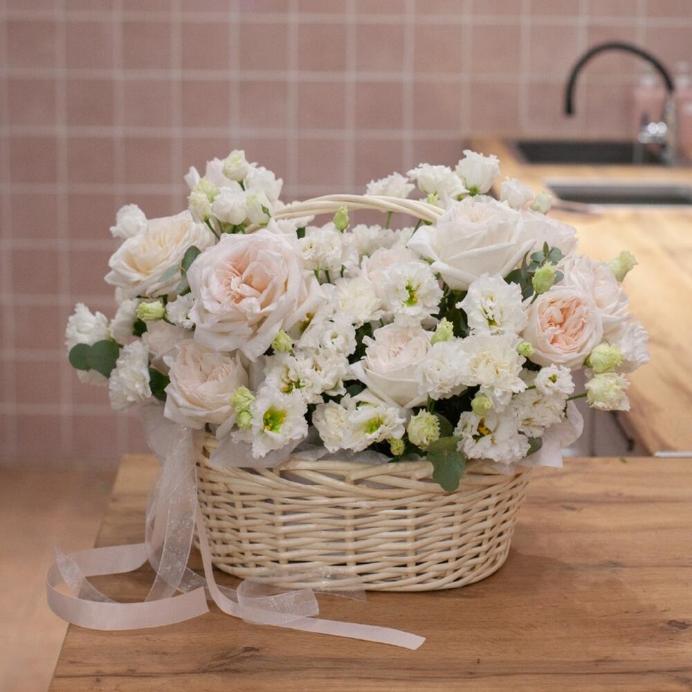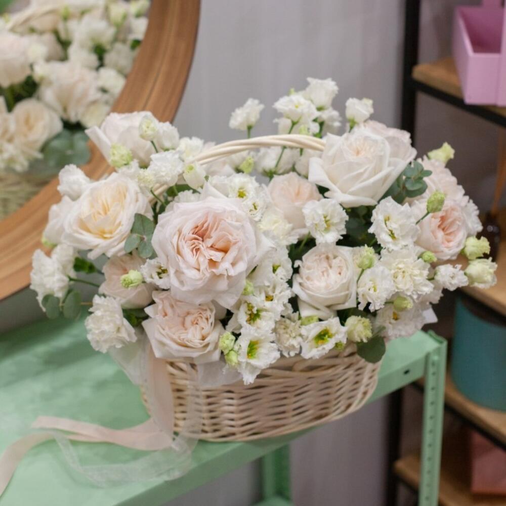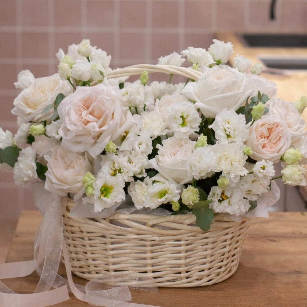 Пионовидная роза – 14 шт.Лизиантус – 7 шт.Диантус – 12 шт.Эвкалипт – 10 шт.Корзина плетеная – 1 шт.